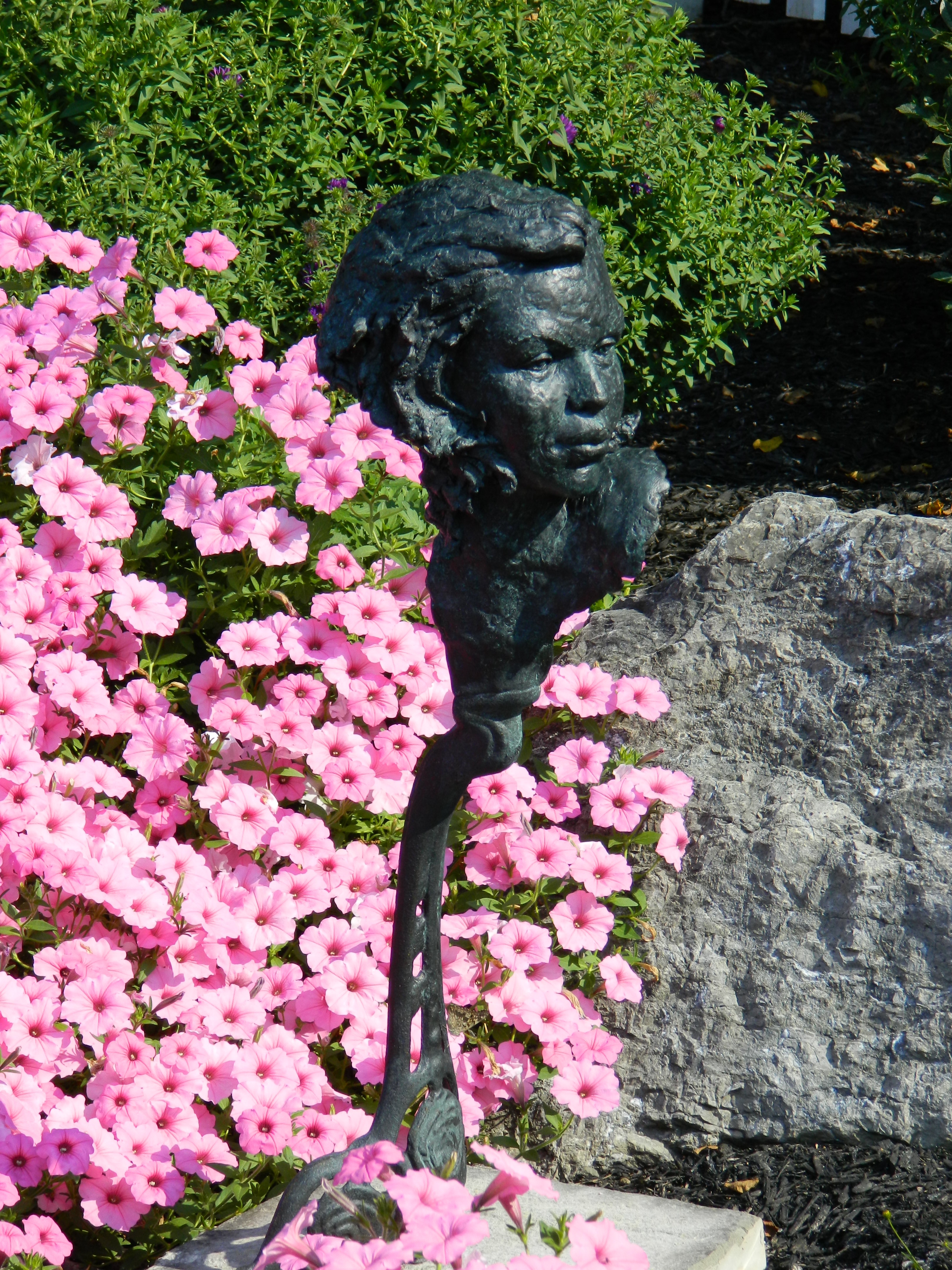 14”x 10”x 10” OOAK epoxy with bronze filled paint and patina. Stone base designed to be placed below water level in fountain or pond.
