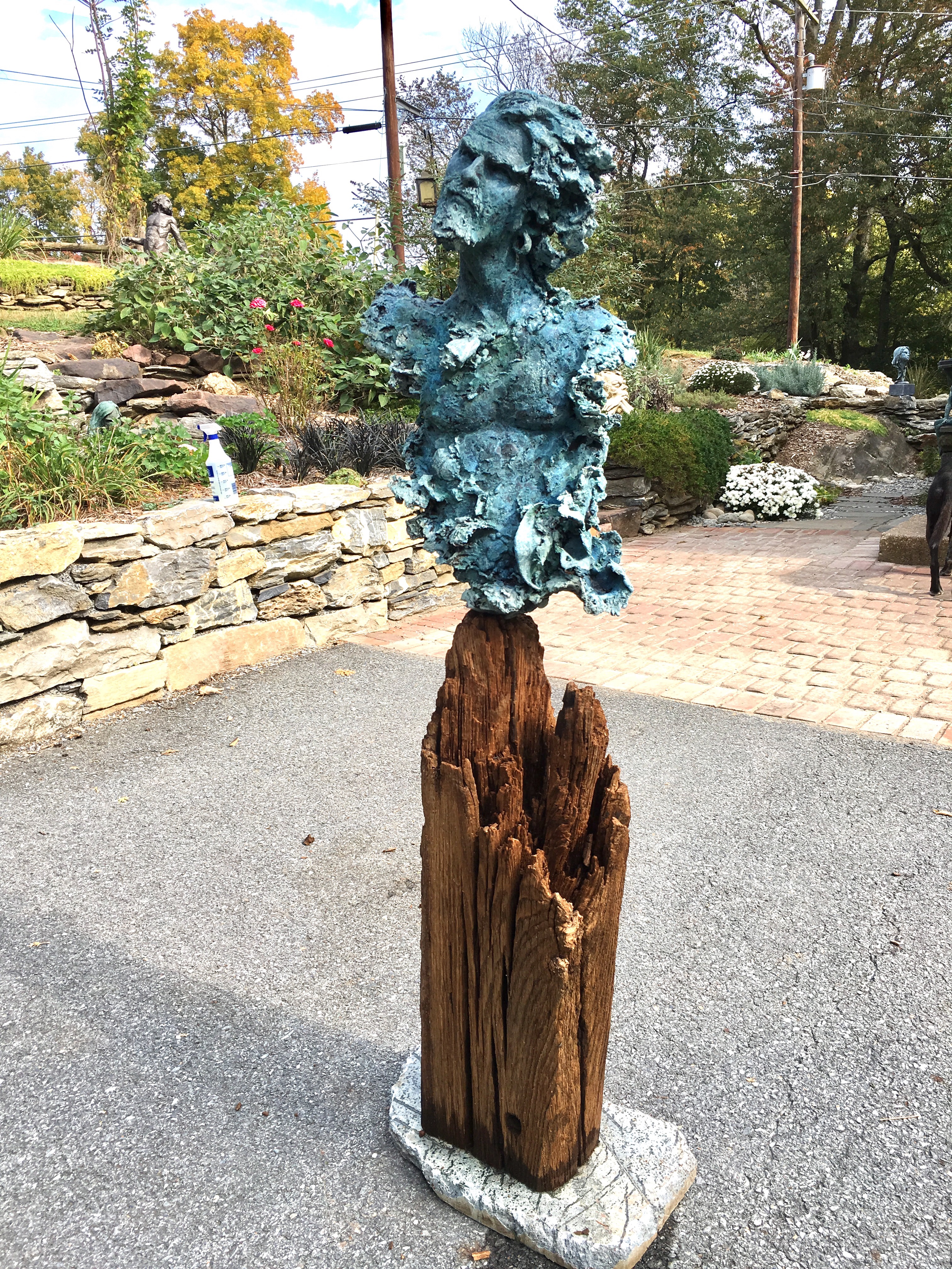 70”x 24”x 20” OOAK epoxy with bronze filled paint and patina. Steel pipe base.