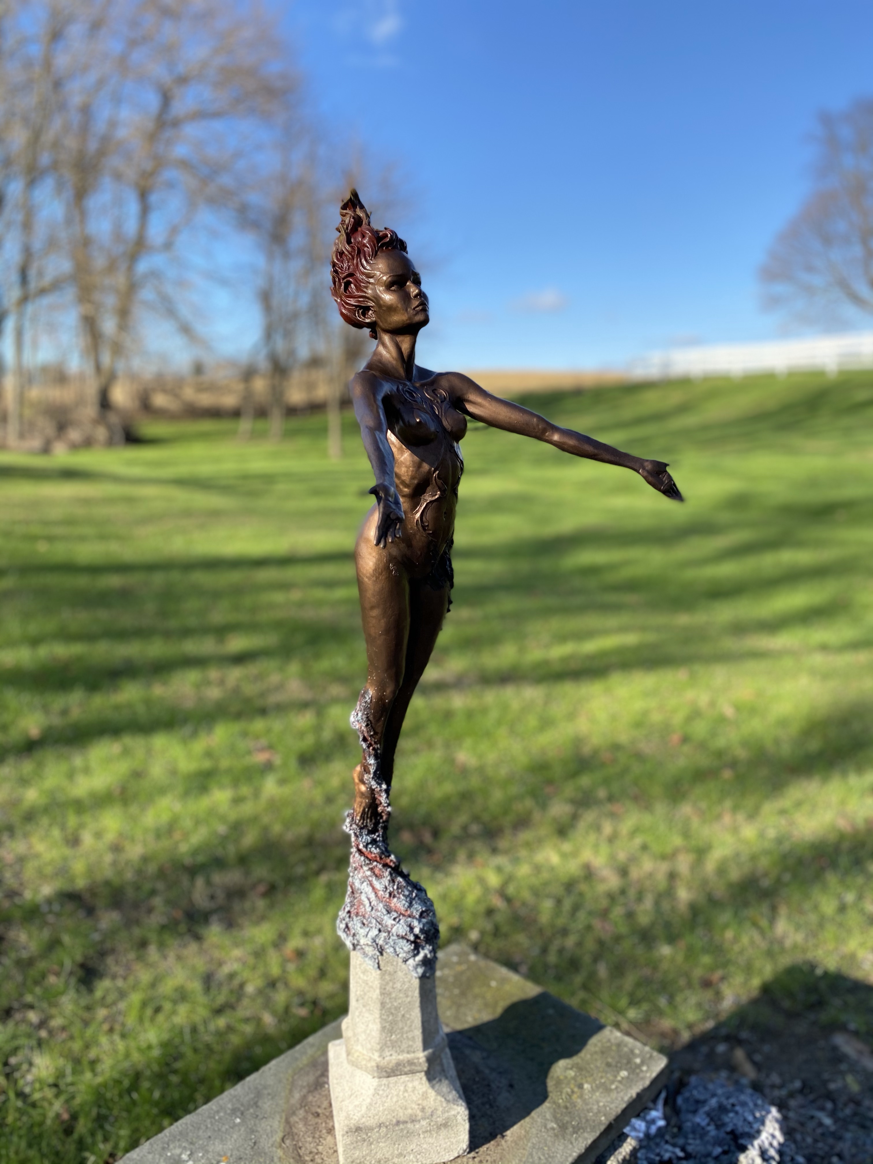 36”x 20”x 20” OOAK epoxy with bronze filled paint and patina. Cast iron base with cast iron support.