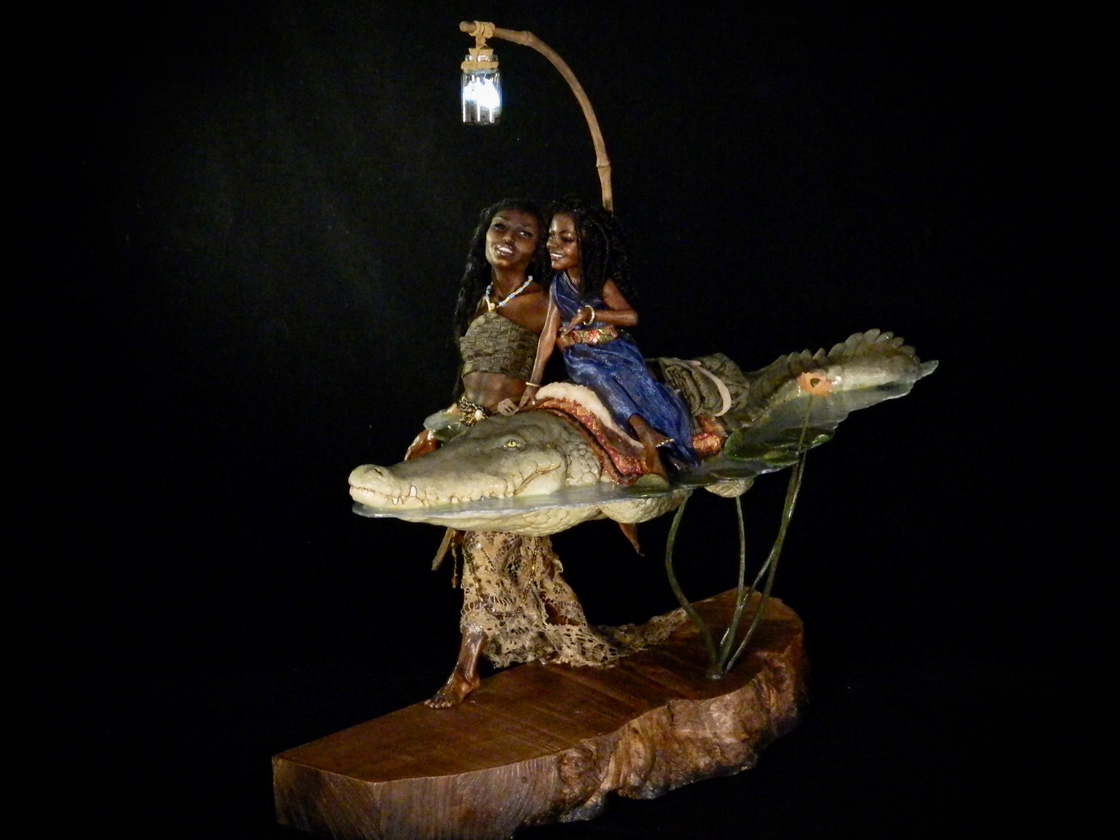 20 x 26 x 12 polymer clay figures with synthetic hair and natural fiber costuming. The water is acrylic and is attached to the gator. The lamp is a “glow bat” with LED; battery is easily replaced on the back of the gator’s leather saddle. Pieces separate for shipping.