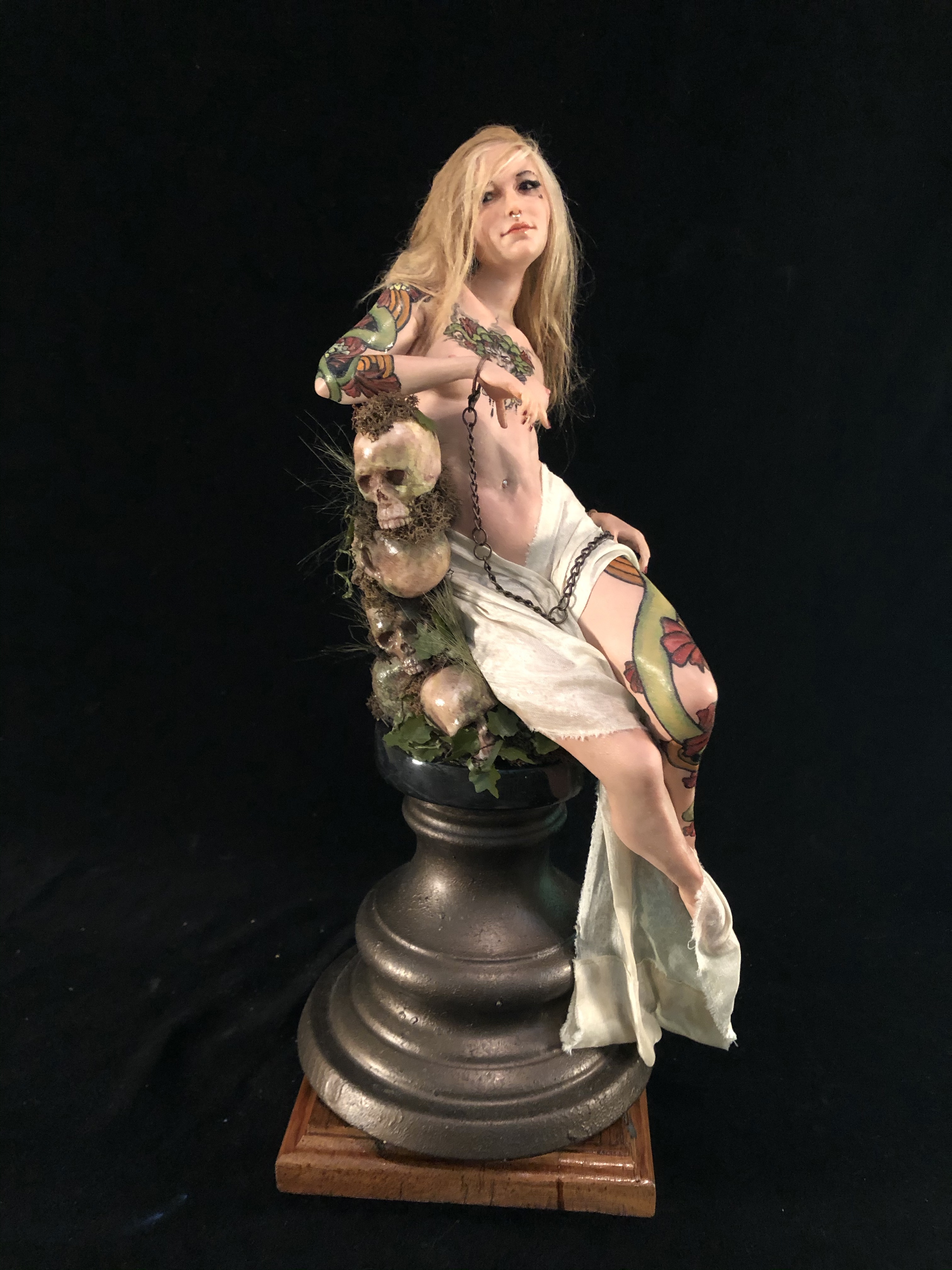 16” figure on a base of resin skulls and brass form. Made of ProSculpt on a wire armature. Wig is Alpaca.